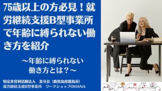 就労継続支援B型とは?仕事(作業内容)や工賃など紹介! 75歳以上の方必見!就労継続支援B型事業所で年齢に縛られない働き方を紹介 令和に突入し「人生100年時代」と言われています。皆さんは「人生100年時代」と聞いて何をイメージしますか?たとえば、年金のみでは生活できない、貯蓄もない、ずっと家にいて生きがいがない、やりたいことがあってもどうすればいいのかわからない。など様々な不安や疑問があるでしょう。本記事では、そんな不安や疑問を就労継続支援B型を通じて少しでも解決に導けるよう働き方や方法について紹介していきます。 2025.10.18 就労継続支援B型とは?仕事(作業内容)や工賃など紹介!